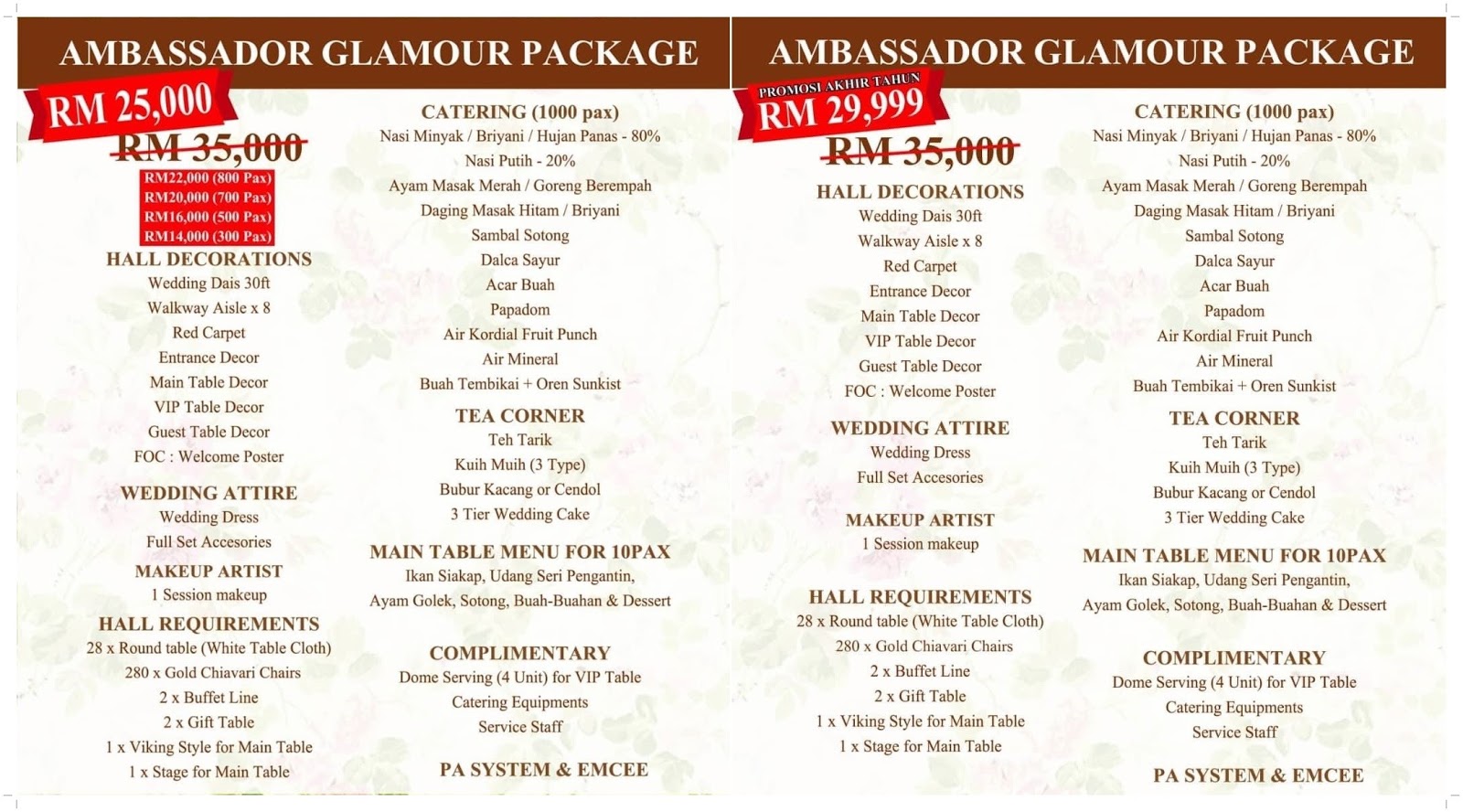berada dalam kelas tersendiri, Ambassador Putrajaya yang merupakan pemilikan penuh syarikat Bumiputera – Hanana Group Sdn. Bhd. yang terletak di Presint 15, Putrajaya bukan sahaja menyediakan dewan perkahwinan malah ia turut menawarkan pakej lengkap untuk pelbagai majlis khususnya majlis perkahwinan termasuklah :